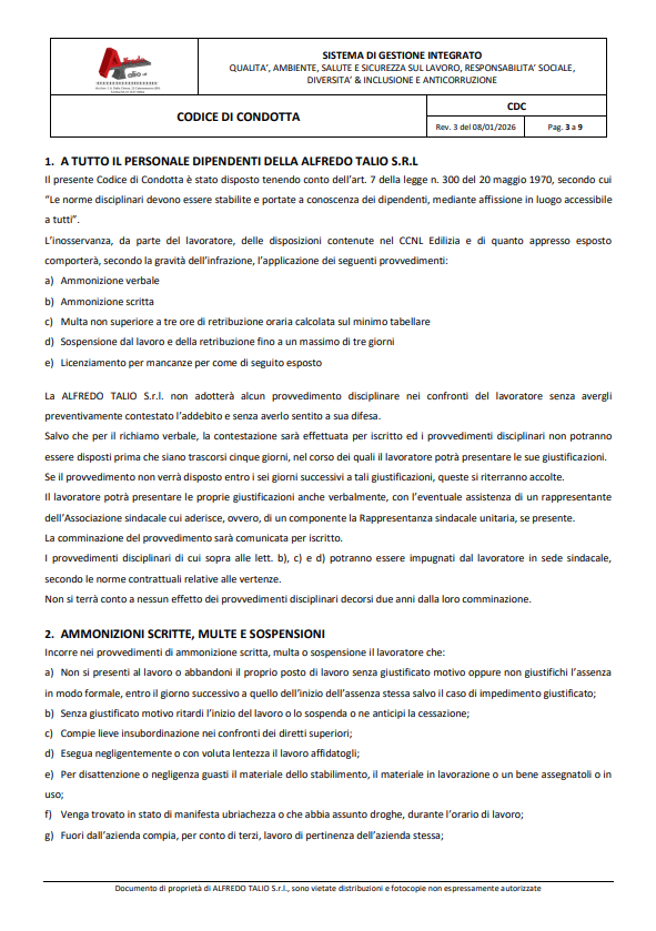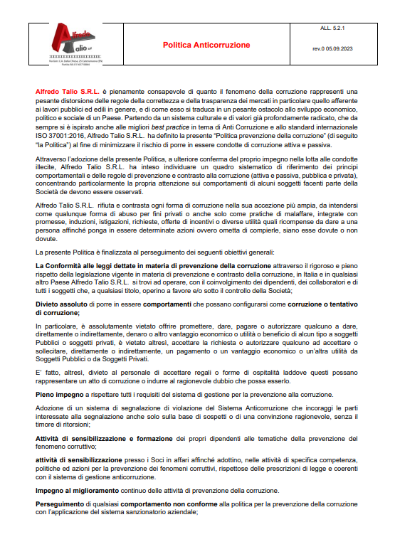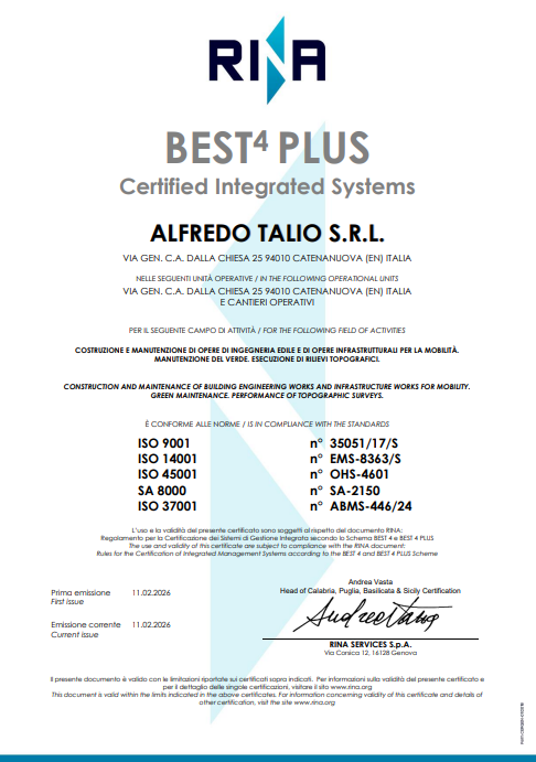 Alfredo Talio S.r.l. ha adottato un Sistema di Gestione Integrato volto a garantire qualità, sicurezza, rispetto dell’ambiente, responsabilità sociale, inclusione e integrità etica nello svolgimento di tutte le proprie attività.